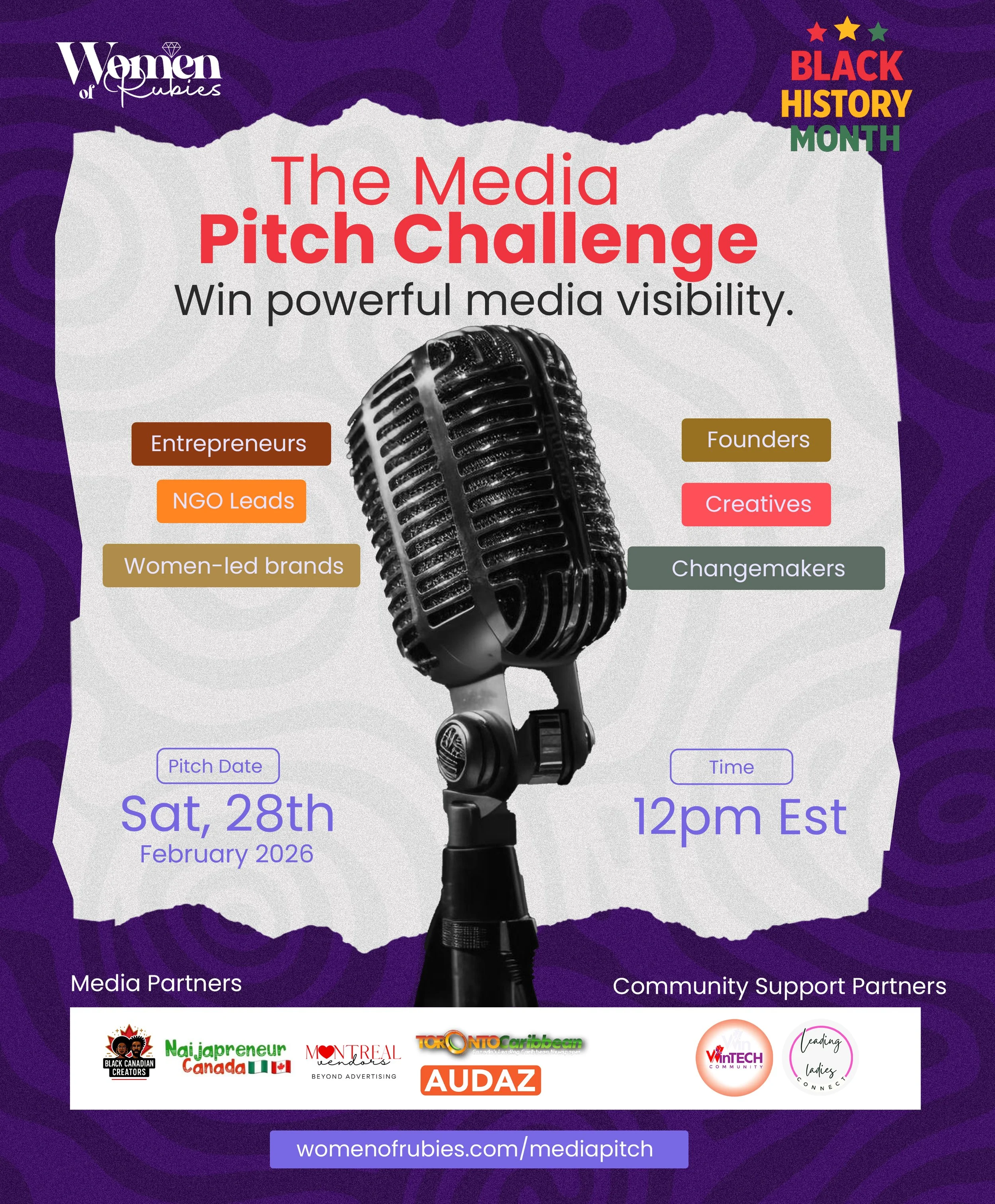 The winner of the Media Pitch Challenge will receive a premium media visibility package valued at $2,500, including featured articles and interviews across Women of Rubies and partner platforms, social media amplification, press support, and a one-on-one visibility strategy session. Partner platforms span digital publications, community media, and creator-led networks.